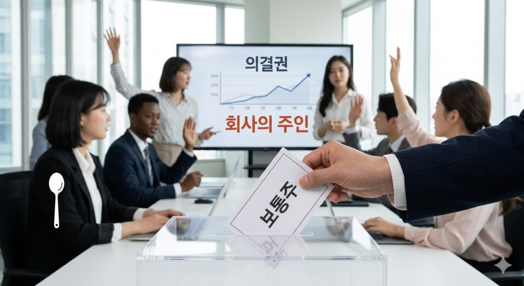 우리가 일반적으로 ‘주식’이라고 부르는 종목들은 대부분 보통주를 의미합니다. 보통주의 가장 큰 특징이자 무기는 바로 **’의결권(Voting Right)’**을 가진다는 점입니다.
